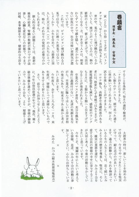 総会は毎回たくさんの人に集まって頂いて、盛大に開催されてきましたが、新型コロナウイルスの感染拡大によって、対面式の行事が自粛されています。そして、総会という、対面式の集まりを開くのが難しくなってしまいました。こうして皆さんに集まっていただき、総会を開くのは、三年ぶりではないかと思います。今日は多くの皆さんに集まっていただきたかったのですが、やはりコロナが完全に収束した状態ではないので、皆さんには委任状や書面を出してもらって、総会に参加していただく形を取りました。それでもやはりみみより会の行事…。