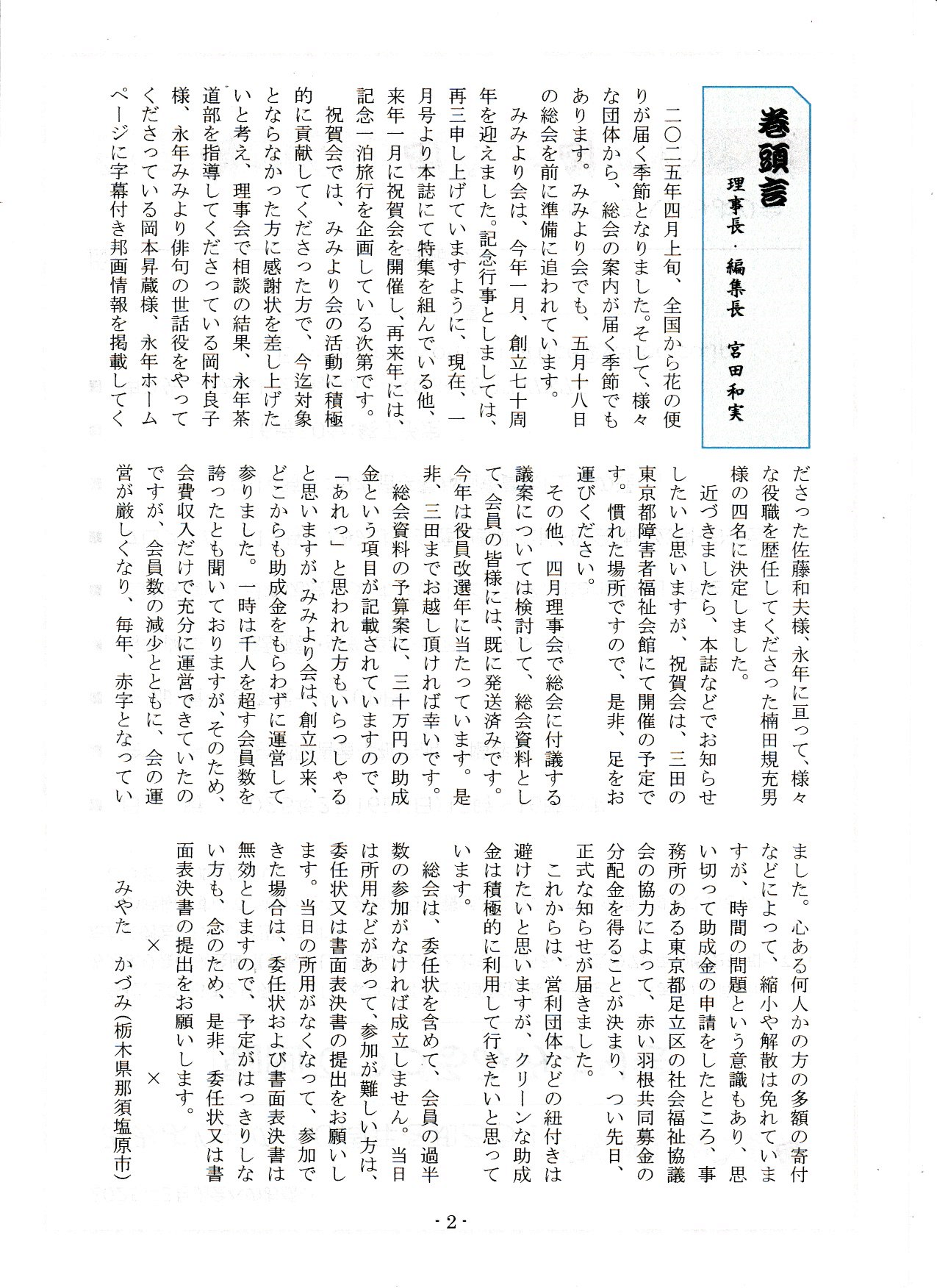 皆さんには事前に委任状と書面表決書を提出していただいていますので、開催そのものには問題はありません。今日は久しぶりに懐かしい顔を、会場でお会いしている方、またオンラインでお顔だけ拝見している方、さまざまでございますが、久しぶりのみみより会の行事、総会ということで、この時間を有意義に楽しく過ごしていただければ、幸いだと思っております。簡単ではありますが、挨拶にかえさせていただきます。よろしくお願いします。